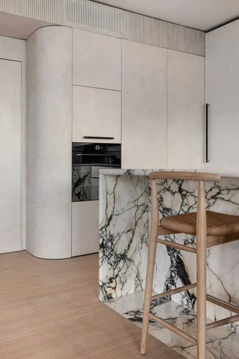 건축가는 거실, 침실, 욕실 등 각 공간에 어울리는 곡선형 가구를 배치했으며, 주방 아일랜드와 테이블의 모서리까지 둥글게 라운딩을 주어 인테리어 컨셉을 충실히 이어가도록 했습니다.