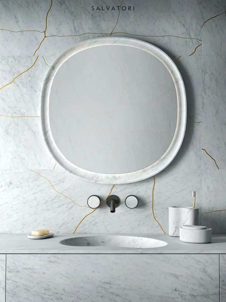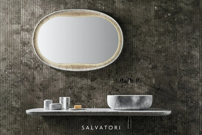 앞서 소개드린 아니마 프리스탠딩 세면대와 동일한 컬렉션인 아니마 거울입니다. 대리석으로 점토의 느낌을 내고자 유체 곡선의 형태를 강조한 바, 평온한 무드를 조성합니다.