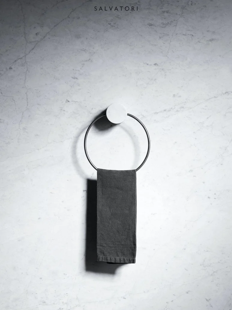 기존의 수건 걸이를 혁신적으로 재해석한 프리스탠딩 타월 랙입니다. 독립적인 메탈 구조와 둥근 대리석 상판이 조화를 이룬 독특한 디자인입니다.