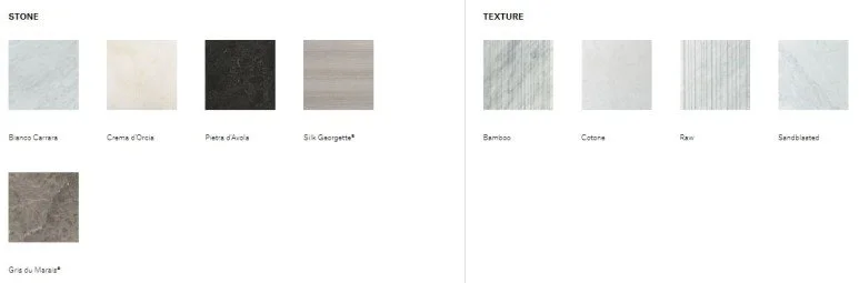 비앙코 카라라(Bianco Carrara), 크레마 도르치아(Crema d’Orcia), 그리스 뒤 마레(Gris du Marais), 피에트라 다볼라(Pietra d’Avola), 실크 조르젯(Silk Georgette) 5가지 석재로 만나볼 수 있습니다.