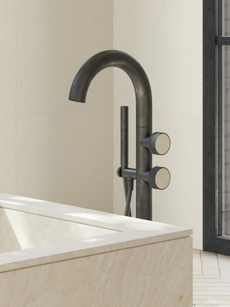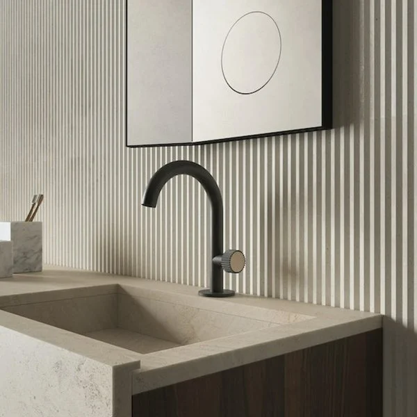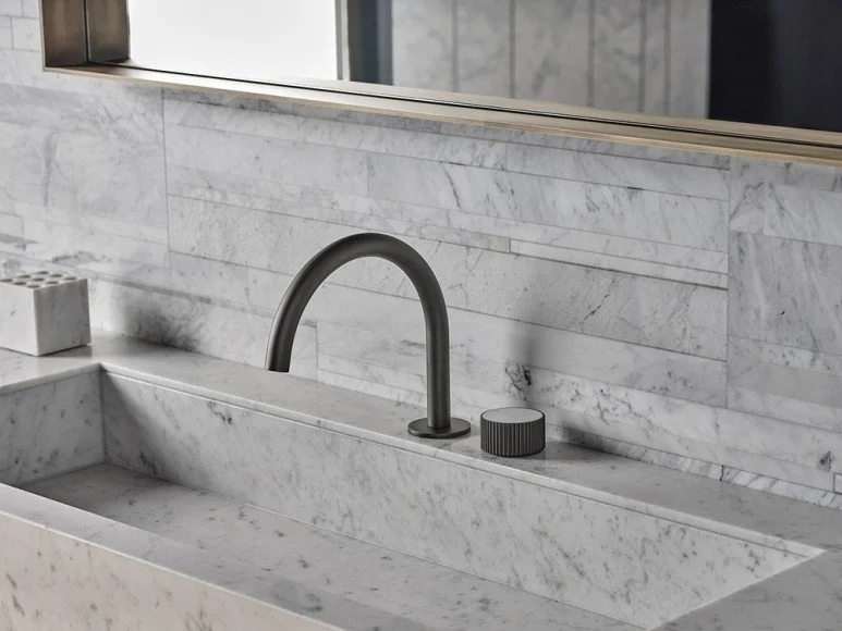 클래식한 대리석과 러프한 건메탈의 강렬한 대비를 유도하여 현대적인 절제미를 표현합니다. 완만한 곡선을 그리는 스파우트와 대리석을 더한 원형 핸들로 욕실에 남다른 우아함을 선사합니다.