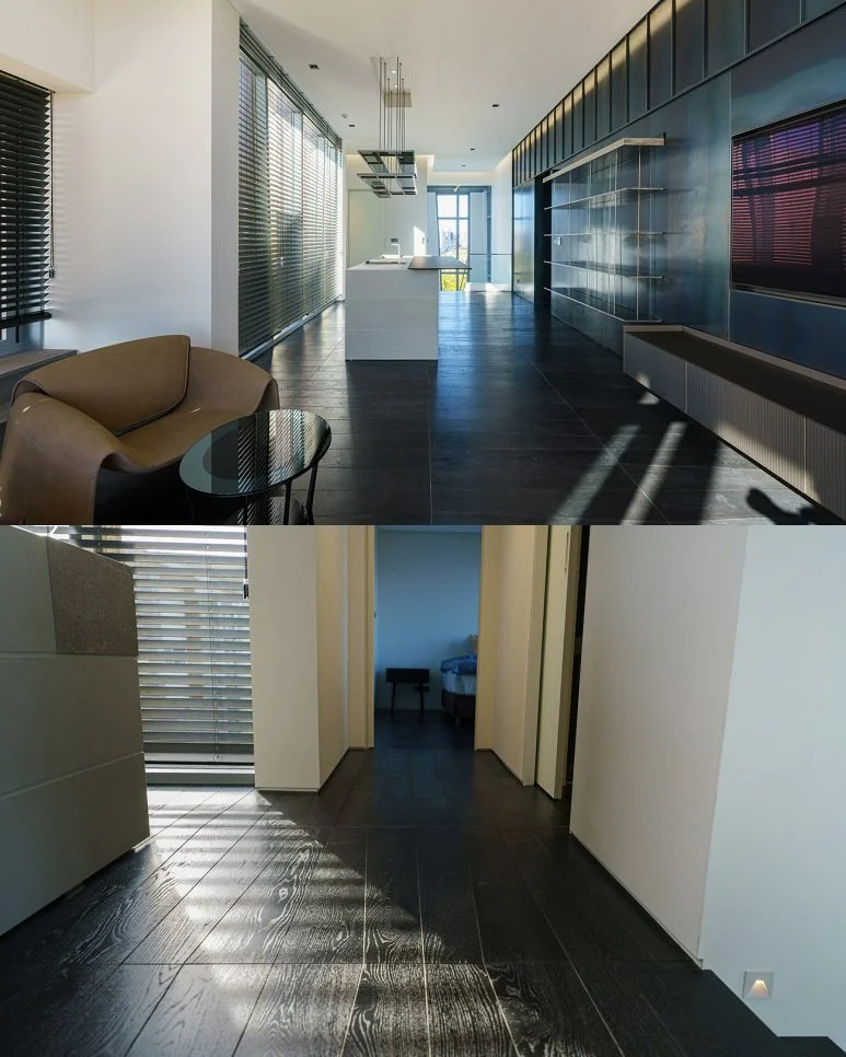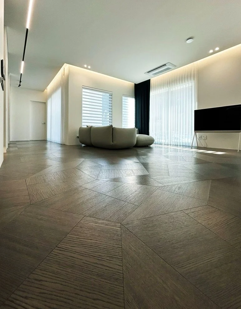 시공 후 뉴트럴 그레이 톤이 점차 짙어져 몬테르지오니의 또 다른 아름다움을 확인하는 시간이 됩니다. 이는 마루 표면처리에 의한 자연스러운 색상 변화입니다.
