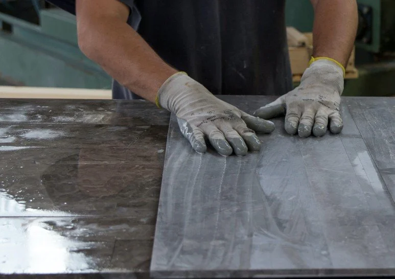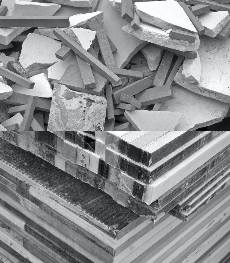 99%의 폐기 돌 조각을 고온, 고압 처리하는 오토 클레이브에 넣어 진공 처리 후, 1%의 콩 레진으로 만든 천연 접착제를 사용해 새롭고 완전한 석재로 재탄생시켰습니다.