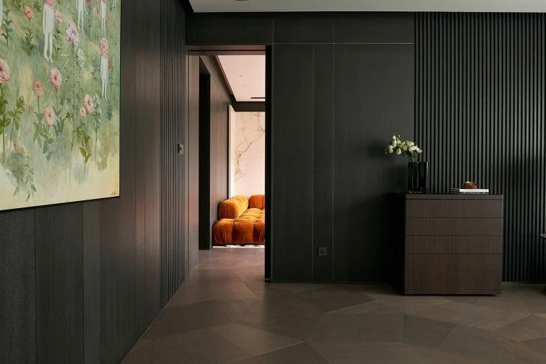 밝은 오크 컬러 마루가 집안을 화사하고 온화하게 만들어 준다면, 어두운 톤의 마루는 공간 전반에 기분 좋은 무게감과 고급스러운 흐름을 부여합니다.