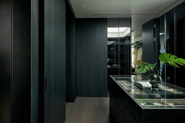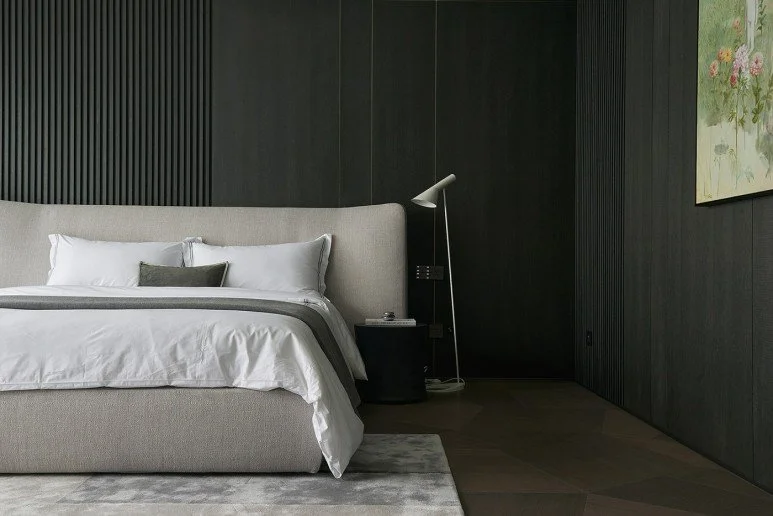 슬라이데는 어두운 자재로 톤온톤 마감되어 단조롭게 느껴질 수 있는 침실에 조형미를 더하고, 디자인의 밀도를 높입니다.