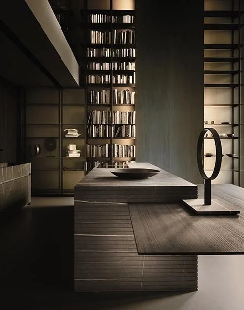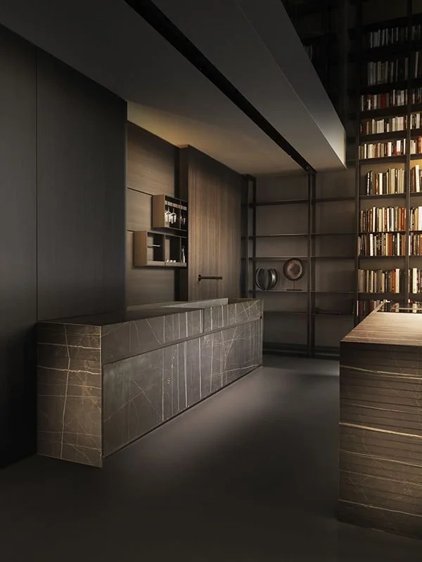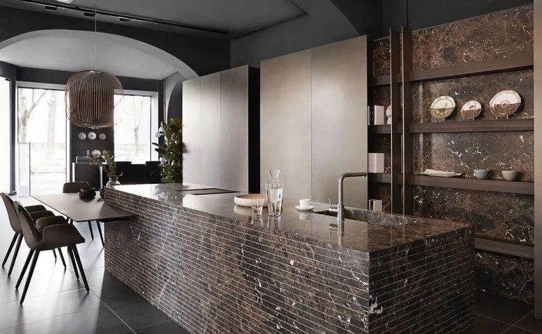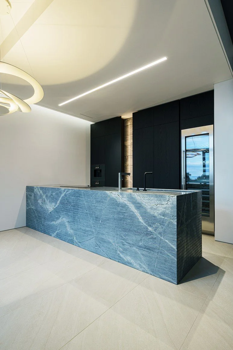다음으로 소개드리는 제품은 남다른 매스감과 웅장함을 자랑하는 모듈노바 블레이드 랩입니다. 리얼 스톤으로 마감한 주방만의 무게감과 실감나는 텍스처를 잘 살린 브랜드의 하이엔드 라인업이에요.