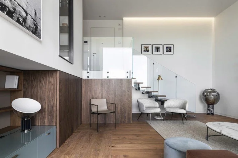 위 이미지처럼 물결이 이는 듯한 사하라 글래스와 노체 우드 구조는 우아하고 패미닌한 분위기를 조성하고, 투 컬러 글래스 매치는 앞선 디자인 보다 세련되고 하이테크한 무드를 전합니다. 동일한 제품인데도 보시는 것처럼 전혀 다른 분위기를 연출하는 도어입니다.