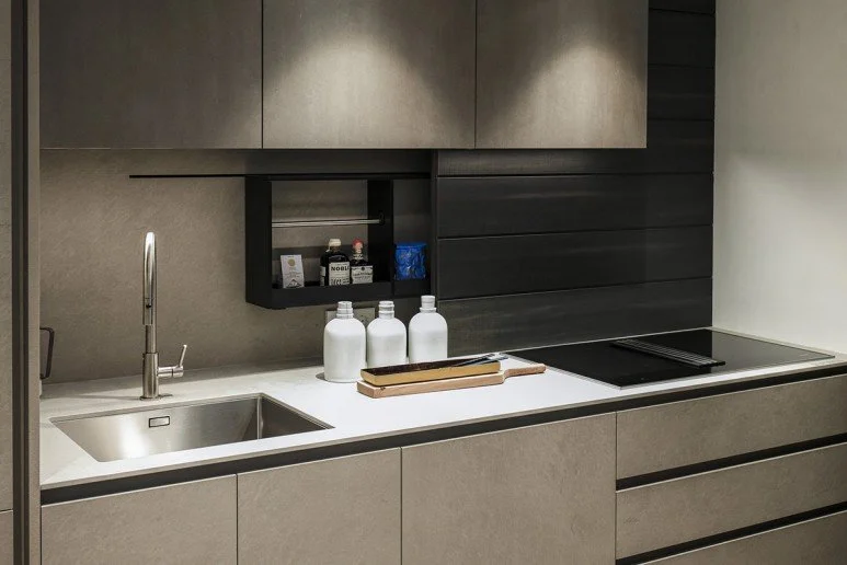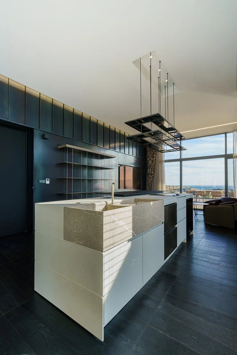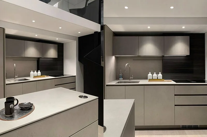 이에 인테리어 컨셉에 부합하는 플라이 키친이 적용되었습니다. 플라이는 브랜드 라인업 중에서도 간결함의 미학을 여실히 전하는 모델입니다.