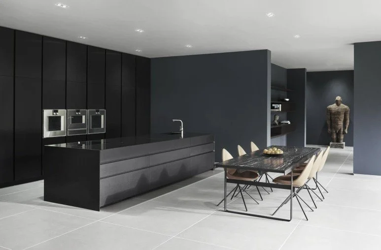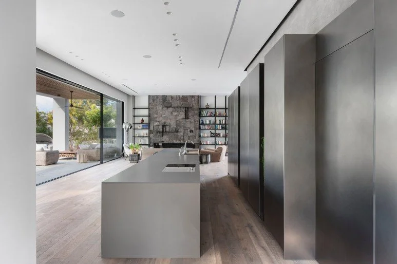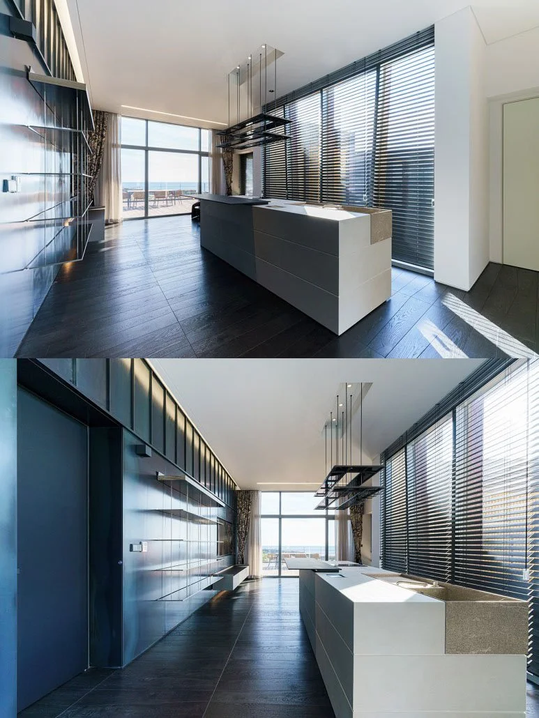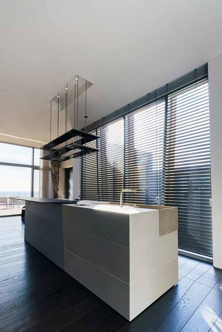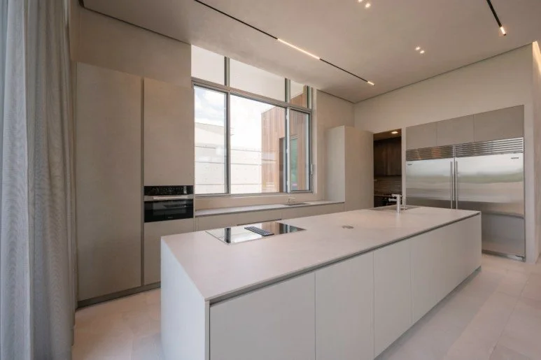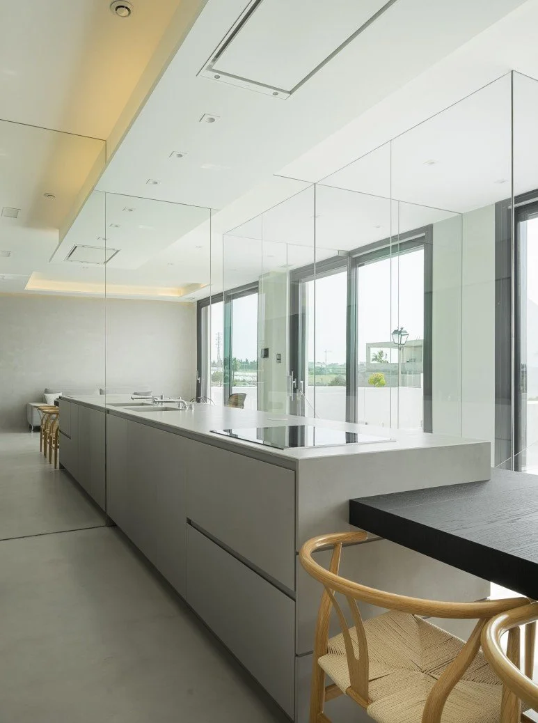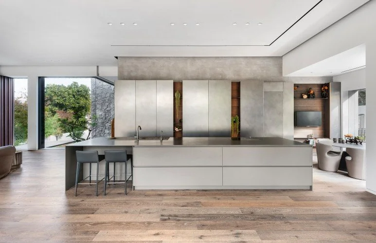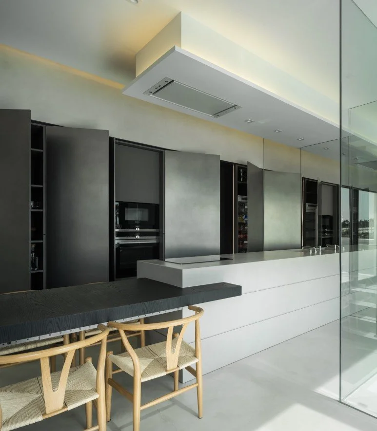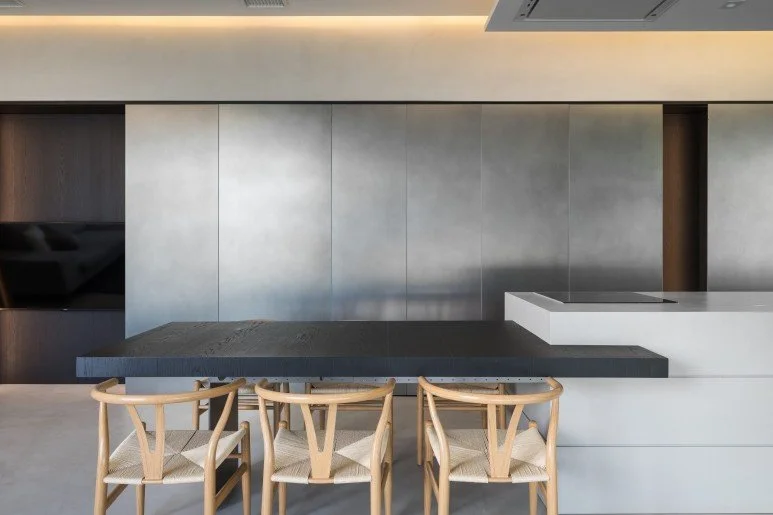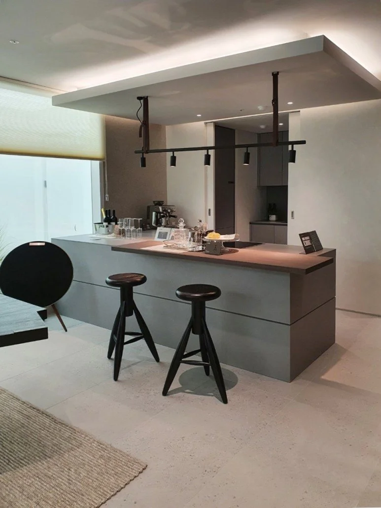 아일랜드의 3분할 메지 라인과 함께 주방 전체를 이루는 깔끔한 선들의 합이 초 미니멀한 무드를 자아냅니다.