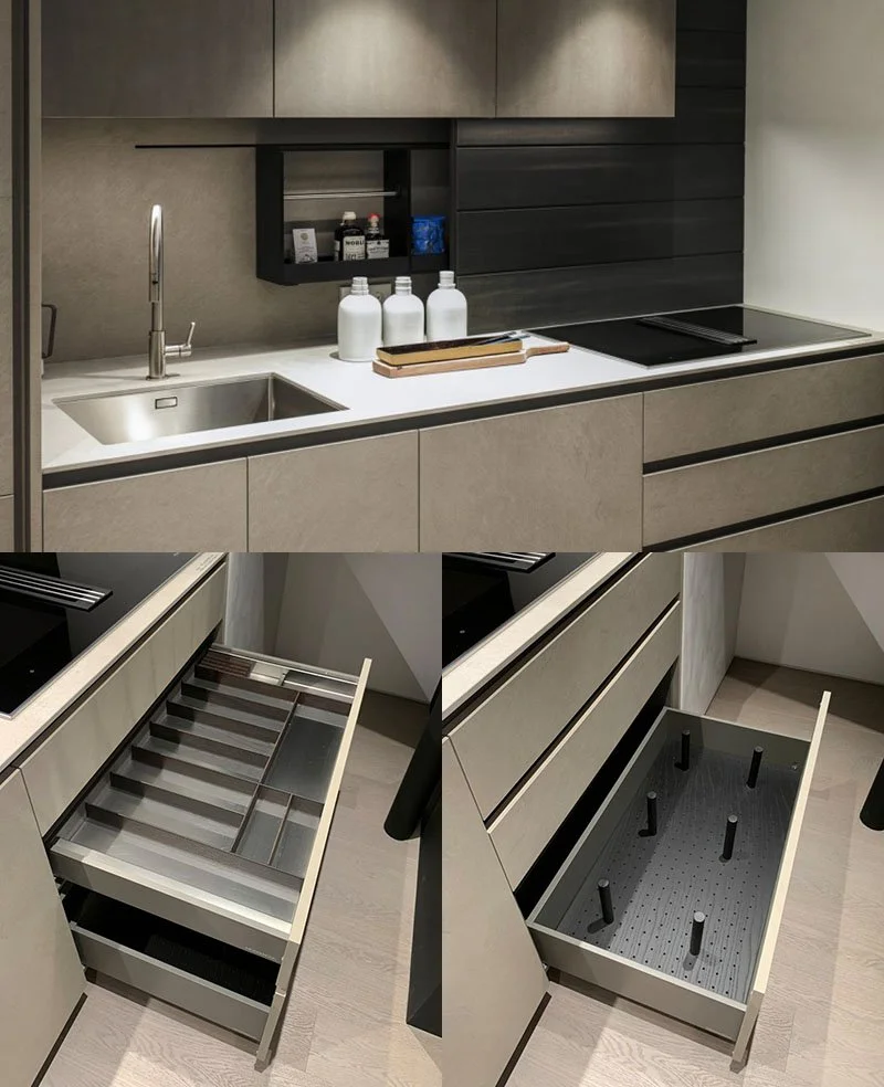 45도 빗각 처리된 사선 그립을 특징으로 하며, 워크탑과 측면 패널을 완벽하게 결합시켜 깔끔하고 정제된 라인이 강조되는 것이 특징입니다.