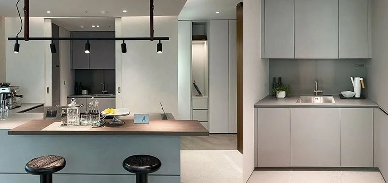 24년 준공 예정인 아스티 논현 모델하우스에 MH6 주방이 적용되었습니다. ㄱ자 아일랜드 구성으로 동선을 최소화했으며, 히든 도어를 이용해 주방을 완전히 숨길 수 있습니다.