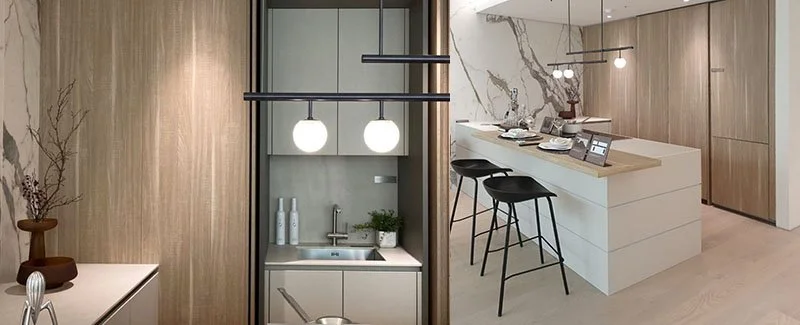 포켓 슬라이딩 도어 안으로 싱크와 상하부장 수납, 빌트인 냉장고를 컴팩트하게 짜 넣은 것을 확인할 수 있습니다. 이 역시 도어만 간편하게 닫으면 주방 전체가 완전하게 가려집니다.