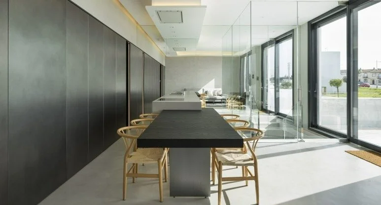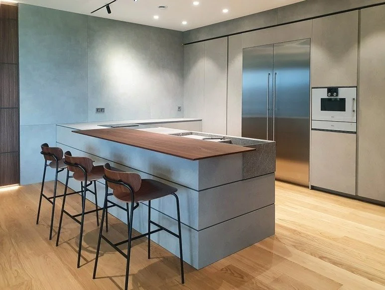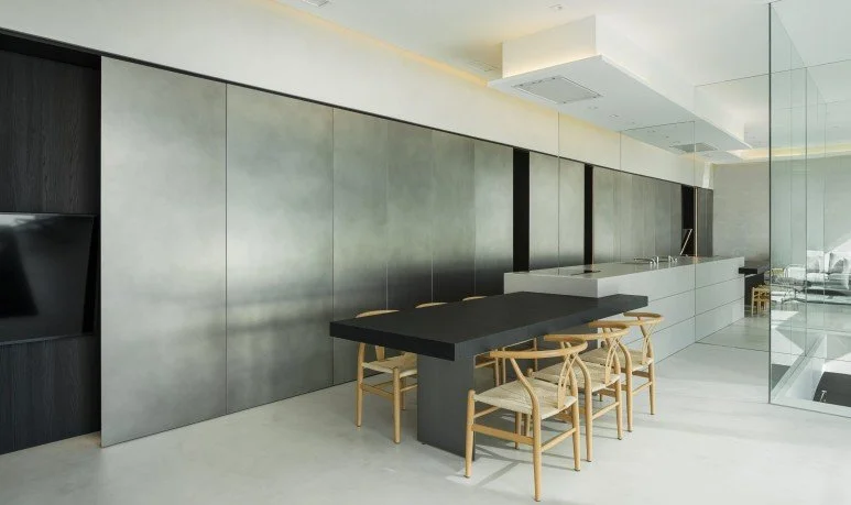 모던한 레진 마감 아일랜드에 중후한 밀텍 로베레 푸모(Miltech Rovere Fumo) 마감 테이블을 일자로 접목하여 각 소재의 이미지가 두드러질 뿐 아니라 트인 느낌 또한 강조하였습니다.