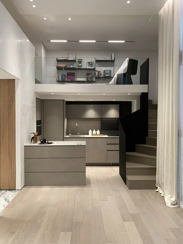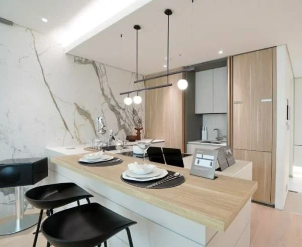 모델하우스에 시공된 55㎡ 타입은 전실 복층형 설계를 통해 3.7m에 이르는 높은 천정고를 지닙니다. 공간적 특성을 반영해 주방 역시 건축미와 확장감을 전하도록 계획되었습니다.