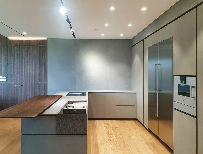 ㅡ자로 확장감 있게 구성된 트웬티 레진(Twenty Resina) 키친입니다. 해당 프로젝트는 레진, 메탈, 우드 등 여러 소재가 폭 넓게 어우러져 다채로운 감각을 이끌어냅니다.