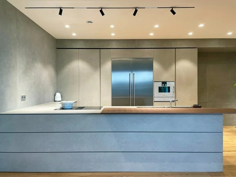 다음으로 소개할 주방은 단란한 가족의 행복이 깃든 주택 사례입니다. 그레이 톤의 차분함과 세밀한 텍스처가 느껴지는 밀텍 소재로 아일랜드 및 키큰장까지 전체적으로 마감해 세련미를 배가했습니다.