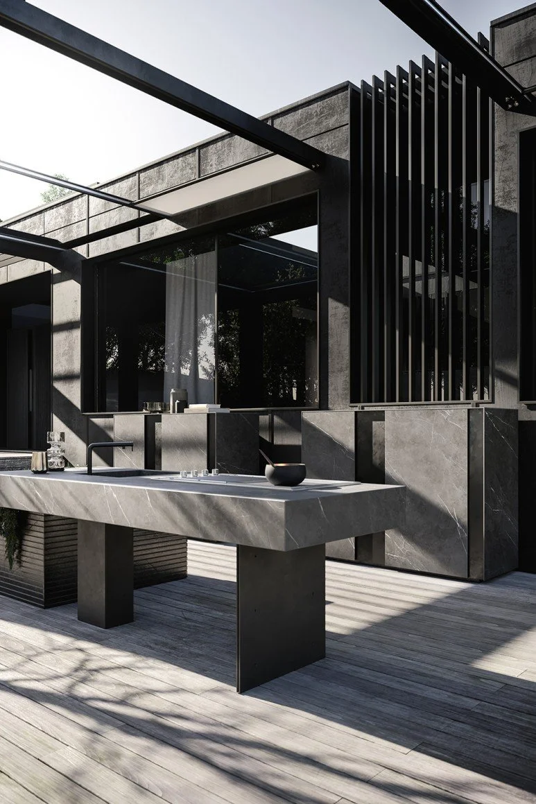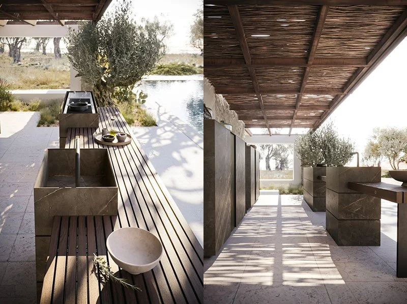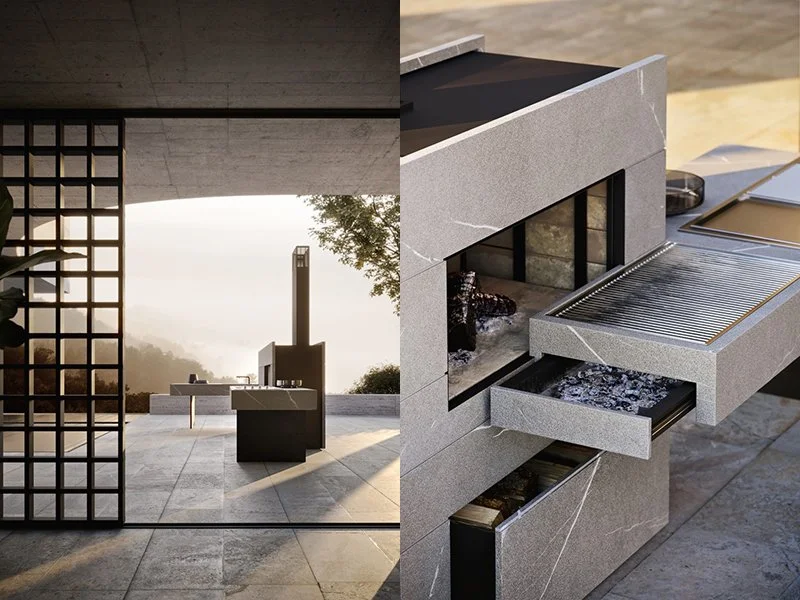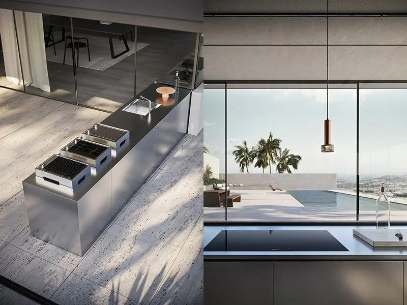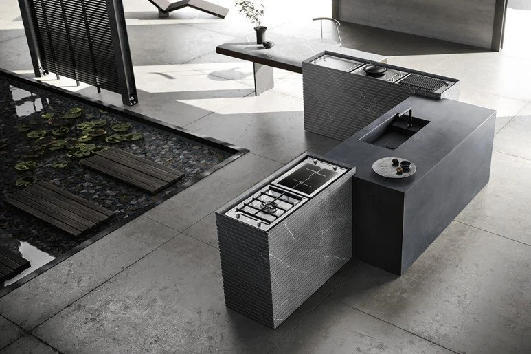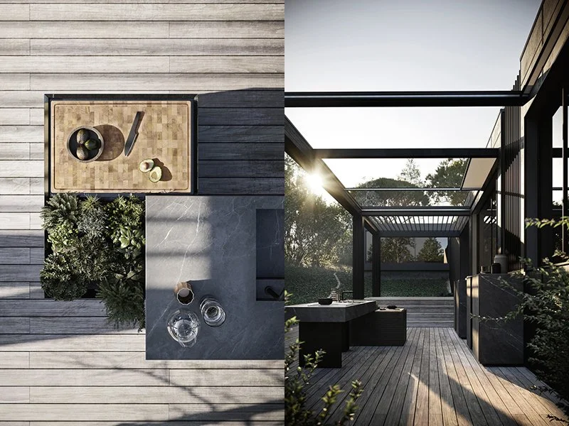 모듈노바의 아이덴티티인 모던한 디자인과 건축미, 텍스처를 부각하면서 야외 환경을 포용할 수 있는 내구성과 기능을 갖춘 주방을 소개합니다.