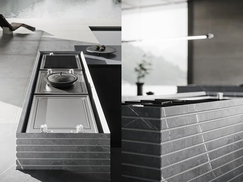 메이트 쿡탑 모듈에는 블레이드(Blade)의 시그니처 메지 디자인을 통해 세련미와 섬세함을 부여했으며, 그라파이트 로우(Graphite Raw) 스톤으로 마감해 차분한 미감을 배가했습니다.