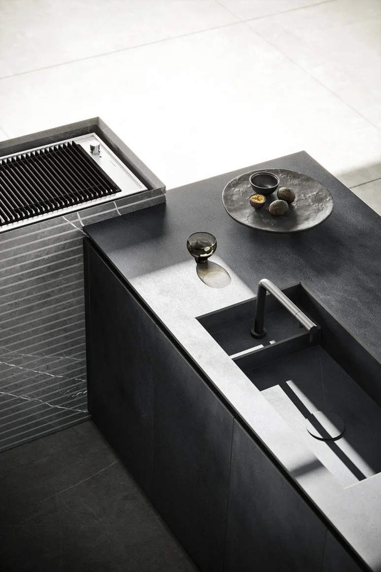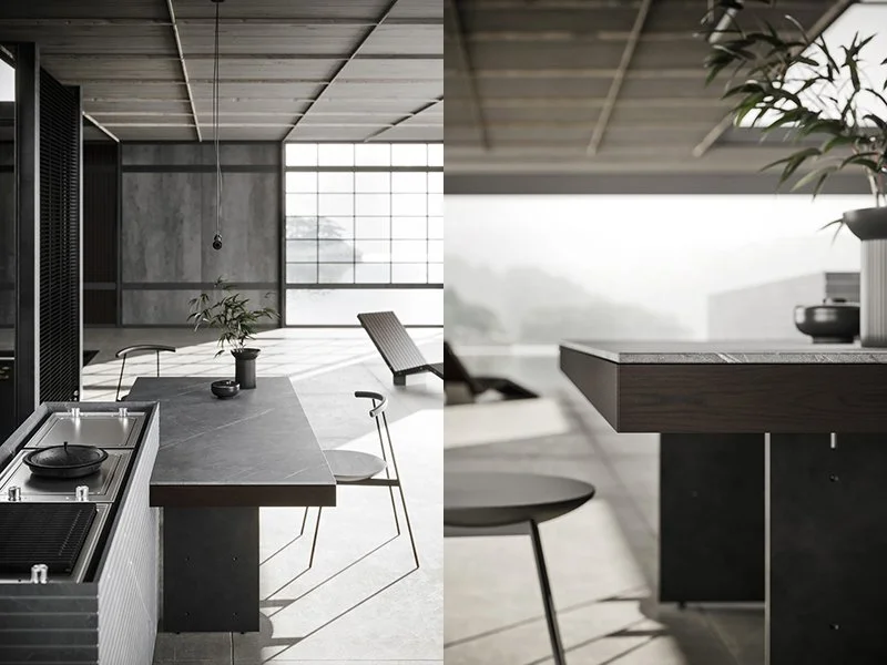 ASG 아일랜드 테이블은 해당 라인업의 포인트 요소가 됩니다. 스테인레스 스틸 구조와 훈증 애쉬(solid wood thermo-treated Ash) 프로파일, 그라파이트 로우(Graphite Raw) 석기 테이블이 맞물려 엣지 있게 디자인되었습니다.
