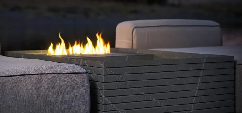 차 한잔의 여유를 즐길 수 있는 티 테이블 역시 사하라 누아르 스톤으로 마감하여 통일감을 주었습니다. 테이블은 바이오 에탄올 난로를 겸해 훈훈한 온기와 포근한 분위기를 조성합니다.