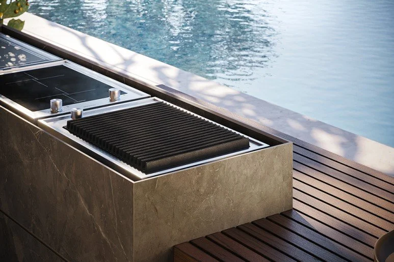 스킬 그레스 주방과 XY 아일랜드 테이블이 매치된 모델로, 아웃도어 키친 중 가장 과감하고 아름다운 형태를 자랑합니다.