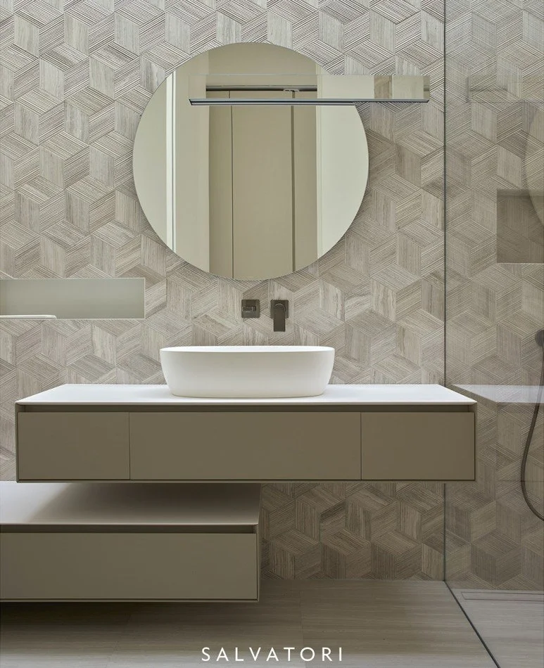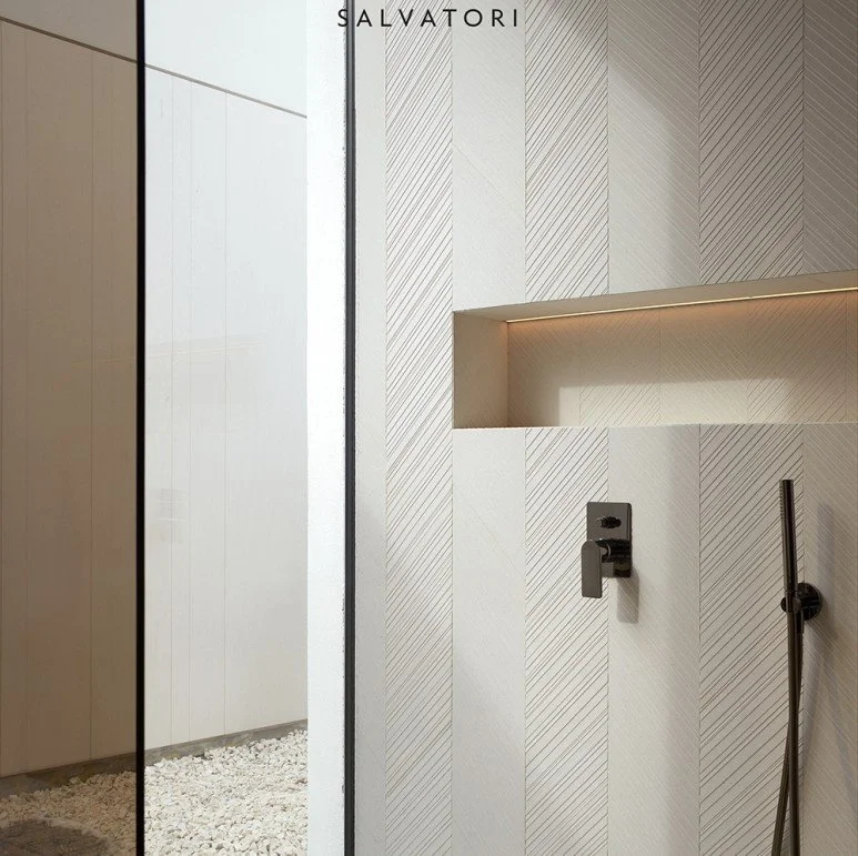 욕실에는 살바토리의 다양한 석재가 적용되었습니다. 롬부는 욕실에 유니크한 감각을 더하는 패턴 중 하나로서 벽면에 다이내믹한 입체감을 부여합니다.