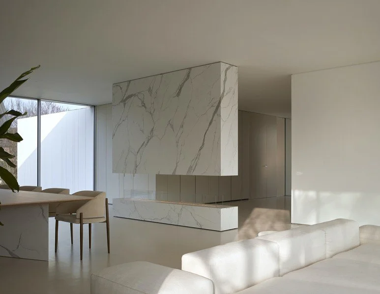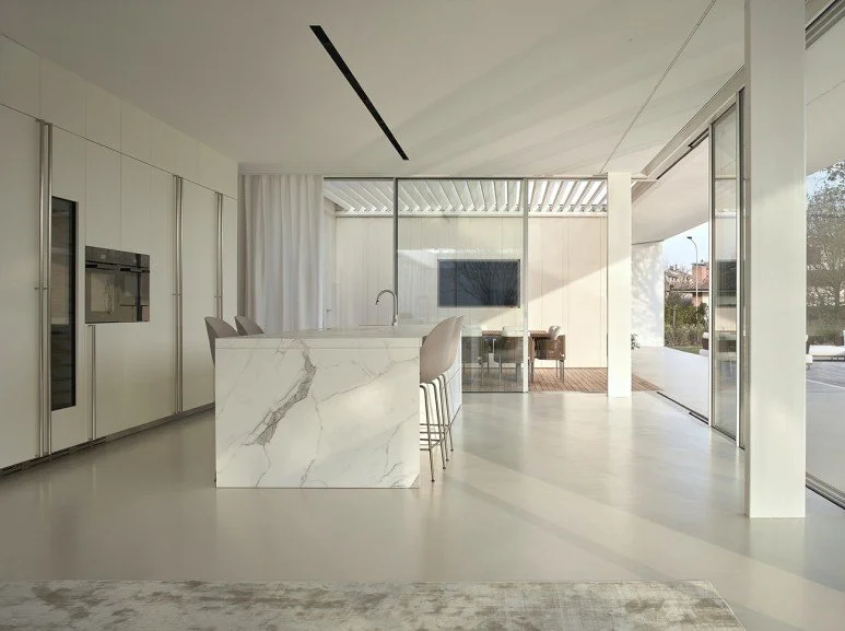 크레마 도르치아 셀렉트(Crema d'Orcia Select), 실크 조젯(Silk Georgette®) 등의 대리석을 사용해 미색의 실내 톤과 자연스럽게 흐름을 이어갑니다.