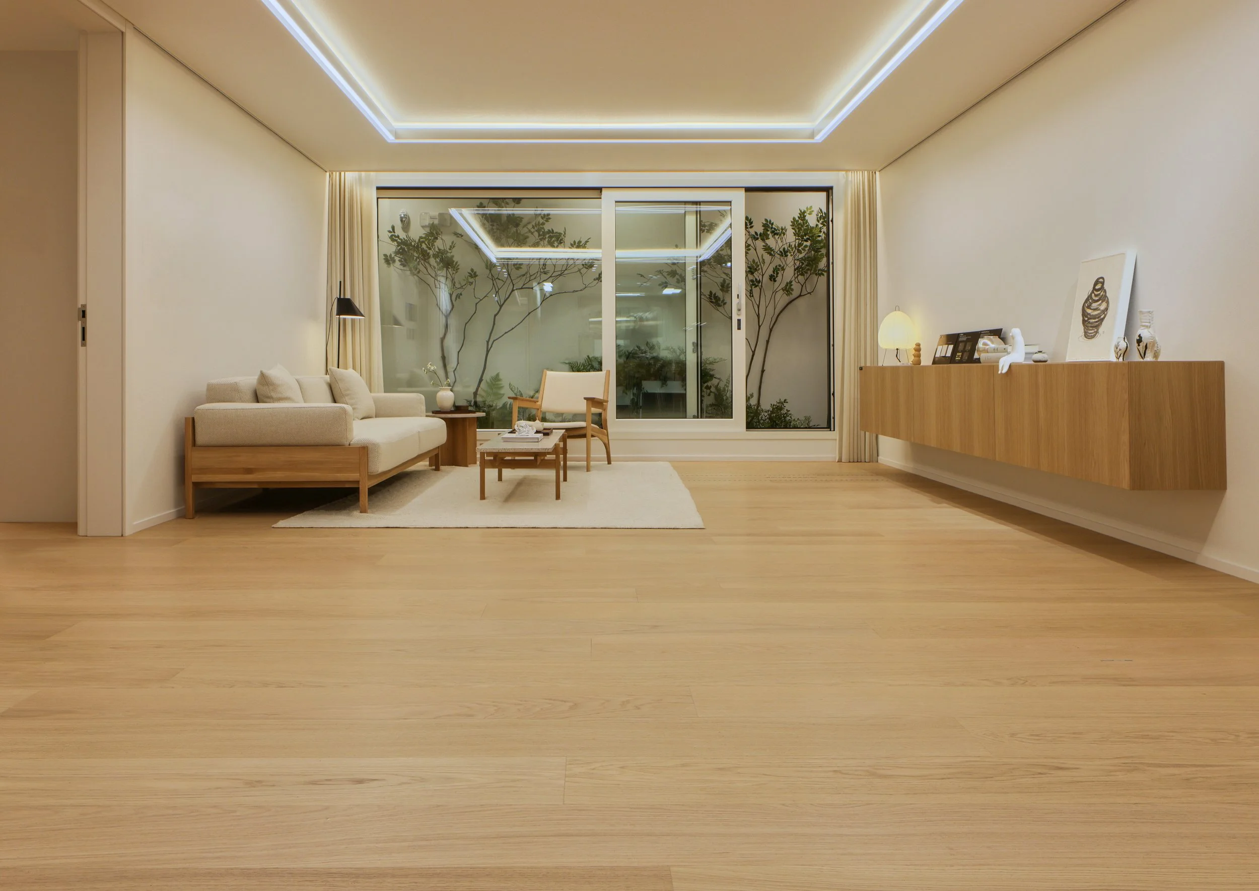 더샵 분당 티에르원 모델하우스에 적용된 오크 비앙코스피노는 자연스러운 오크톤의 질감을 강조해, 공간에 따뜻하고 편안한 분위기를 더하며 확장형 설계의 개방감을 한층 돋보이게 만든다.